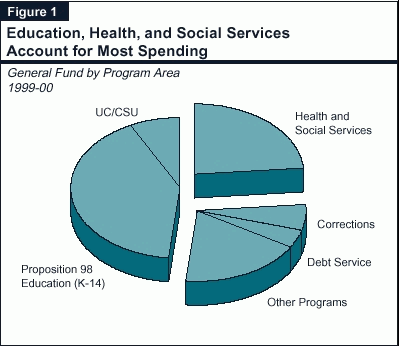 Figure 1 (see page 20) shows how General Fund spending is distributed among major programs in 1999-00. Slightly less than half of the total is devoted to education spending, of which 41 percent is for Proposition 98 education (K-14) and about 7 percent is for University of California (UC) and California State University (CSU). Slightly less than one-fourth of the budget is for health and social services, and 6 percent is for corrections. The remainder is for state operations, debt service, various local subventions (including the vehicle license fee [VLF] backfill), and other purposes.