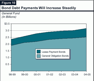 Debt Payments. As shown in Figure 10, we estimate that General Fund debt costs (for general obligation and lease-payment bonds) will increase from $2.4 billion in 1998-99 to about $3.2 billion in 2004-05. This is an average annual increase of 5 percent. Our forecast assumes that almost $15 billion (an average of around $2 billion each year) in bonds will be sold over the forecast period. As a percent of total debt, lease-payment bond debt remains at about 20 percent throughout the forecast period based on currently authorized lease-payment bonds.