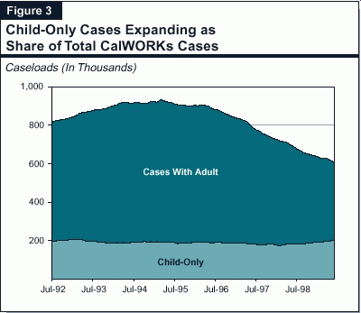 Child-Only Cases On the Rise. While the overall CalWORKs caseload has been declining during the past few years, one segment of that caseload--child-only cases--has been increasing. Examples of child-only cases include situations where the parents are undocumented immigrants or the children are being cared for by a nonneedy relative. In 1995, about 21 percent of the AFDC caseload was comprised of child-only cases. As of June 1999, the percentage of child-only cases had increased to approximately 33 percent. Figure 3 shows that cases with adults have been declining rapidly, while the child-only caseload stayed constant during the early-to-mid 1990s before beginning to increase over the past 18 months.