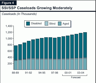 Caseload Trends and Projections. During the late 1980s and early 1990s the caseload grew rapidly, with most of the growth being in the disabled component of the caseload (see Figure 4). In the mid-to-late 1990s, the caseload leveled off and declined by 1.2 percent in 1997-98. This period of essentially no growth is partially attributable to federal policy changes that (1) eliminated drug and alcohol addiction as qualifying disabilities, (2) made certain legal noncitizens ineligible for assistance, and (3) restricted eligibility for certain relatively less disabled children. Since March 1998, the caseload has been growing.