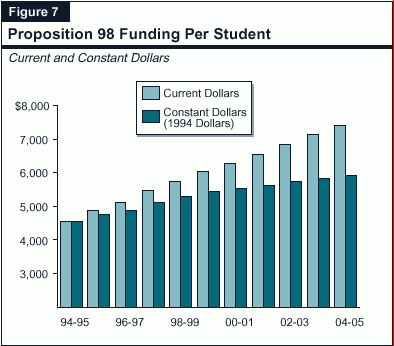 K-12 Funding Projections. Figure 7 displays our projected K-12 per-pupil spending from 1994-95 through 2004-05 (in both "current" and inflation-adjusted dollars). These estimates, which are derived from our Proposition 98 forecast, reflect real (that is, inflation adjusted) per-pupil increases of about 1.6 percent each year between 1999-00 and 2004-05. These additional resources--amounting to over $500 million each year--would permit modest expansion of existing programs and/or funding for some new programs.