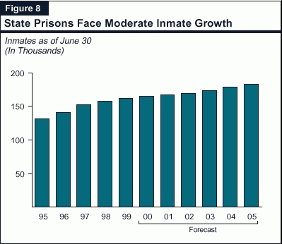 Key Forecast Factors. The continued projected increases in General Fund support for CDC reflect the continued growth in the prison inmate population that is expected during the forecast period. Our estimates through 2004-05 are based on the CDC's projections that the inmate population will exceed 183,000 by June 2005. That represents an increase of as many as 21,000 inmates, or about 13 percent, over the six-year projection period. (The population projections are shown graphically in Figure 8.)