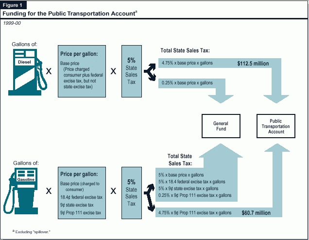 Sales Taxes on Diesel and Gasoline Two Main Sources of PTA Revenues. The state currently collects for state expenditure purposes a 5 percent sales tax on all goods sold in California. The TDA designates a portion of these revenues to the PTA, with the remaining sales tax revenues deposited in the state General Fund. As Figure 1 shows, the PTA derives its revenues primarily from sales and use taxes on diesel fuel and gasoline as follows.