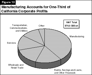 Figure 13 shows the distribution of corporate profits by industry during 1997. It shows companies in the manufacturing sector accounted for about one-third of total statewide profits during the year. Within manufacturing, a large share of earnings is attributable to companies in the computer and electronics industries. Other industries with significant shares of overall earnings are finance, services, trade, and transportation/public utilities.