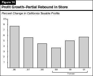 Our outlook calls for continued modest profits growth in 1999 and a mild acceleration thereafter, as shown in Figure 14 (see next page). We specifically forecast that profits will increase by 4 percent in 1999, 5 percent in 2000, and 5.4 percent in 2001. Underlying this aggregate forecast is the assumption that most sectors will experience moderate profit growth over the next three years, but that earnings in 1999 will be held down by continued softness in the high-tech manufacturing sector.
