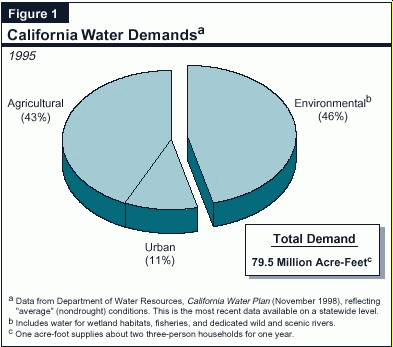 Projected Water Shortfalls. In past years, the average annual water supply has generally been sufficient to meet demands. However, the Department of Water Resources (DWR) projects that, by 2020, demands will exceed supplies by 2.4 million acre-feet (maf) in normal rainfall years and by 6.2 maf in drought years, absent further actions to increase water supplies and/or reduce demand. (One acre-foot of water supplies about two three-person households for one year.) To put this shortfall in perspective, total urban water use in the state is about 8.8 maf. Most of the growth in demand will come from the urban sector, where demand is projected to increase by more than 35 percent between 1995 and 2020.