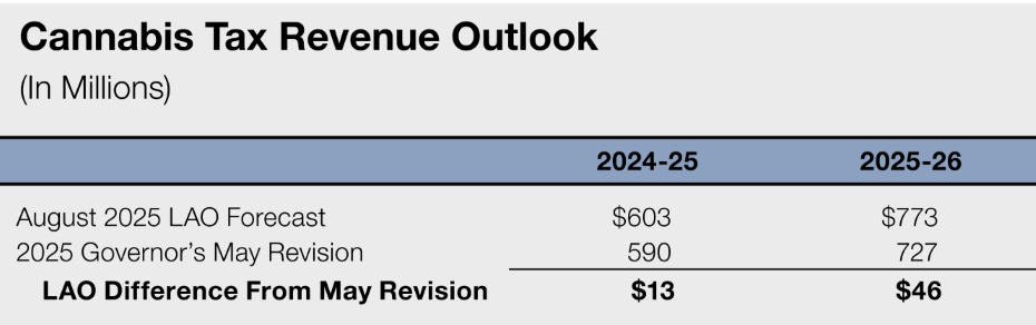 Current LAO Estimate for 2024-25: $603 Million. We currently project cannabis tax revenues of $603 million in 2024-25 and $773 million in 2025-26. As shown in the figure below, these estimates are slightly higher than the revenues anticipated by the 2025-26 budget package, which used a forecast from the 2025 Governor’s May Revision. Our forecast and the administration’s both reflect the recent tax increase noted above. Both forecasts assume that this tax hike will reduce the size of the licensed cannabis market. This negative effect, however, likely will offset only a small share of the revenue raised by the tax hike.