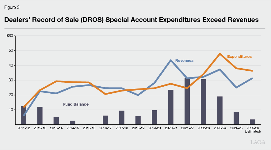 DROS Special Account Is the Primary Special Fund Supporting BOF. The DROS Special Account is the primary special fund supporting BOF activities. This is because it receives the most fee revenue. Additionally, the statutorily permissible uses of the fund are quite broad. Specifically, the DROS Special Account may generally be used to offset DOJ’s reasonable costs of firearm-related regulatory and enforcement activities pertaining to the sale, purchase, manufacturing, lawful or unlawful possession, loan, or transfer of firearms. As shown in Figure 3, DROS Special Account revenues often fluctuate from year to year, generally reflecting changes in fee levels and the number of firearms sold. DROS Special Account expenditures routinely exceeded revenues prior to 2019-20—resulting in the decline of the fund balance. To help ensure sufficient revenues would be available to support BOF workload, Chapter 736 of 2019 (AB 1669, Bonta) enabled DOJ to increase the DROS fee charged from $19 to $31.19. For a couple years after this fee increase, revenues generally exceeded expenditures—thereby allowing the fund balance to steadily grow. However, beginning in 2022-23, expenditures began outpacing revenues, shrinking the fund balance. The Governor’s budget estimates that the DROS Special Account will be insolvent in 2026-27 if no action is taken.