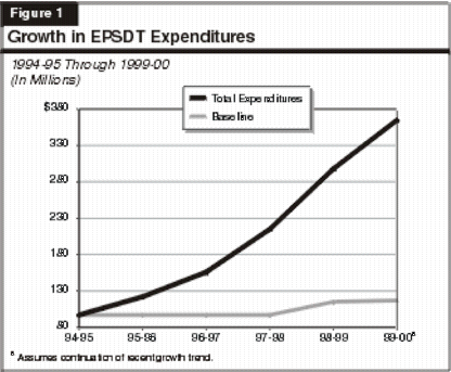 Significant Growth Since 1995-96. While DMH indicates that it originally intended to cap the state's share of costs for EPSDT services after expenditures leveled off, that has never occurred. Service costs have increased significantly every year (see Figure 1), from $25 million above the baseline in 1995-96 to an estimated $189 million above the baseline in 1998-99. If budget-year expenditures increase by the same amount as current-year expenditures, the state will spend $248 million ($120 million from the General Fund with the remainder being federal funds) above the baseline for EPSDT mental health services in 1999-00. This would be an increase of nearly 900 percent in just four years. According to DMH, the large increase in expenditures on children and adolescents include both increased services for existing clients as well as services provided to new clients.