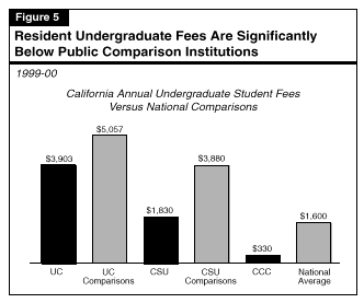 Figure 4 (see next page) shows student fee levels at California's public colleges and universities. The Governor holds resident student fees constant across the segments. The budget includes $19 million for UC and $15 million for CSU to compensate them for revenue they would have otherwise obtained if they raised fees by 4.5 percent. The budget assumes that if fees were to rise, they would rise with California per-capita personal income.