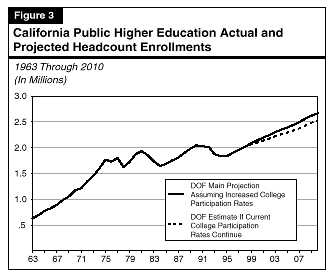 The budget proposes a $750 million increase in General Fund expenditures for higher education in 2000-01. This is an increase of 9.8 percent above estimated expenditures in the current year. This funds enrollment growth above demographic projections for all three segments. It also funds base increases at twice the rate of inflation for the University of California and the California State University and at the rate of inflation for the California Community Colleges. The budget also provides funding for several new and expanded program initiatives.