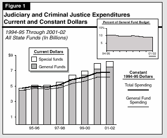 The budget proposes total expenditures of $8.2 billion for judiciary and criminal justice programs in 2001-02. This is an increase of $300 million, or 3.8 percent, above estimated current-year spending. The increase is due primarily to a projected increase in the state's prison and parole populations, new and expanded state and local criminal justice programs, and increases in the cost of state support for trial courts.
