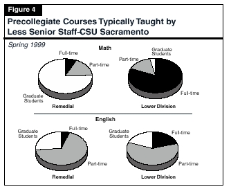 Precollegiate Courses Likely Cost Less Than College-Level Courses. Evidence suggests that precollegiate courses are likely to cost less than college-level courses. Figure 4 shows, for example, that CSU Sacramento uses disproportionately more graduate students and part-time instructors for precollegiate courses than for regular lower division courses. These courses therefore are likely to be comparable in cost (or might even be less costly) than community college courses.