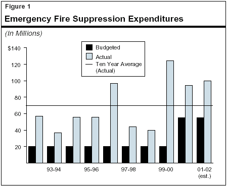 In the past, if the costs for emergency fire suppression exceeded the amount budgeted in the e-fund, then the department has sought additional funding through a deficiency appropriation. Over the past decade, expenditures for emergency fire suppression have consistently exceeded the base amount of funding provided in the budget for this purpose. The base amount of funding was $20 million until 2000-01, when it was increased to $55 million in recognition of the history of underbudgeting. However, in spite of the higher base amount, estimated 2001-02 expenditures from the General Fund for emergency fire suppression will still require a $45 million deficiency appropriation.
