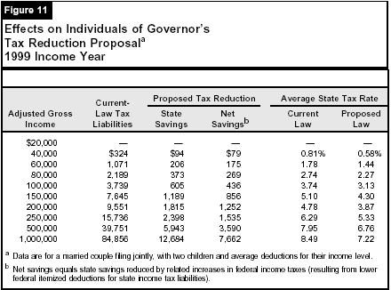 Effects on Individuals Would Vary Widely by Income Level. Figure 11 (see next page) provides an example of how the tax proposal, when fully implemented, would affect individual taxpayers. For illustrative purposes, the example assumes a married couple filing a joint return, with two children and tax deductions equal to the actual average for California taxpayers having their same income level. The example shows: