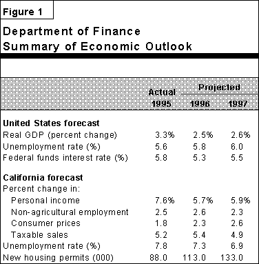 The Budget's California Forecast. The administration's California economic forecast assumes that current growth trends will continue, and that the California economy will expand at a moderate rate during the next two years. As indicated in Figure 1, the administration projects that wage and salary employment will increase by 2.6 percent in 1996 and 2.3 percent in 1997, while personal income will expand by 5.7 percent and 5.9 percent during the two years.