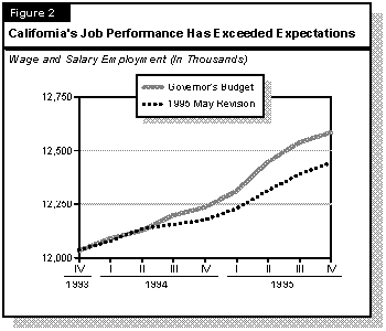 The California economy outperformed expectations in 1995. Based on current historical data, it appears that 342,000 wage and salary jobs were added between November 1994 and November 1995. As shown in Figure 2, the jobs performance was considerably stronger than the May Revision forecast, which itself was slightly above the consensus view of economists last spring. The greater- than-expected job gains have been led by strong performances in the state's international trade, commercial electronics, tourism, entertainment, and business and professions industries. Gains in these industries have more than offset ongoing weakness in the state's finance and aerospace sectors. The past year marked the first time since 1989 that the rate of job growth in California exceeded that of the nation as a whole.