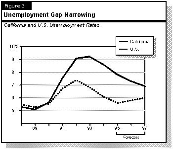 Job growth in California is projected to exceed the nation's rate in both 1996 and 1997, reflecting the number of fast-growing export and service industries in the state. As a result, the gap between the California and U.S. unemployment rates should close significantly by 1997 (see Figure 3).