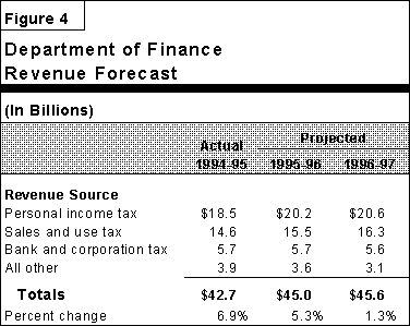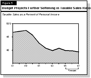 This underlying 5 percent revenue growth rate, however, is still somewhat low in relation to the budget's projected gains in the economy. This reflects the Department of Finance's assumption that key revenue-related variables will expand more slowly than the general economy over the next year. Figure 5 (see next page) shows, for example, that under the budget's projections, the ratio of taxable sales to personal income will continue to soften in both 1996 and 1997.