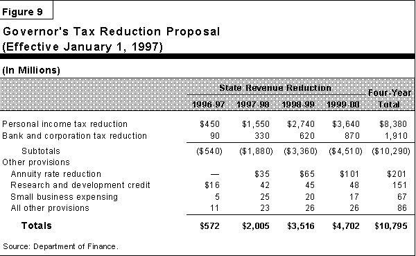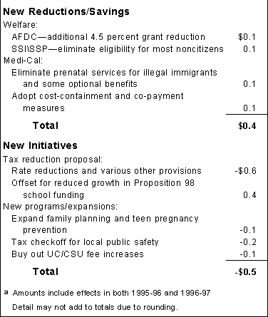 The Governor's budget proposal for 1996-97 contains many of the same elements as his initial proposal for 1995-96, including tax cuts, welfare reductions, full funding for corrections, and significant increases for K-12 and higher education. He also proposes making permanent the welfare and renters' credit savings.