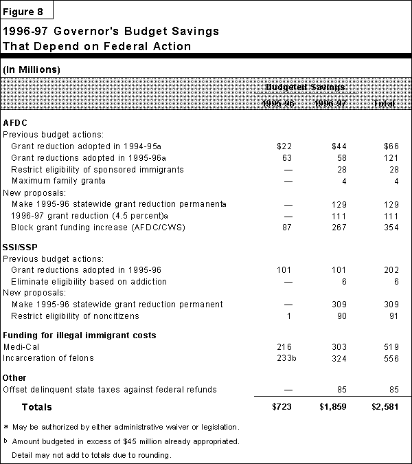 Savings Dependent on Federal Action. Many of the savings proposals and assumptions in the Governor's Budget depend on federal action, either legislation or administrative waivers. Federal legislation which would accomplish these savings is being considered in Washington, D.C. As Figure 8 shows, most of the proposals requiring federal action are in the health and welfare area. Of the total $2.6 billion of savings requiring federal approval, almost $2 billion relates to health and welfare programs.