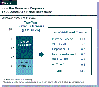 As shown in Figure 1, the Governor proposes to allocate these additional revenues among several areas. The major new proposals for ongoing commitments are a phased-in 75 percent reduction in the VLF and an increase in K-12 Proposition 98 spending.