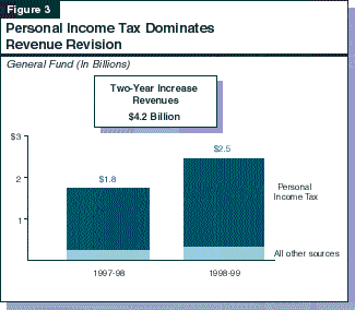 The administration's revised revenue forecast is up substantially from its January budget forecast by nearly $1.8 billion in 1997-98 and $2.5 billion in 1998-99, or $4.2 billion for the two years combined (see Figure 3).
