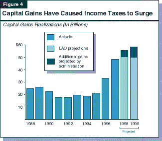 For 1998 and 1999, the administration is projecting continued increases in capital gains, expecting them to rise by 15 percent in 1998 and another 5 percent in 1999. As a result, capital gains would total over $58 billion in 1999, or more than two-and-one-half times their level just four years before.