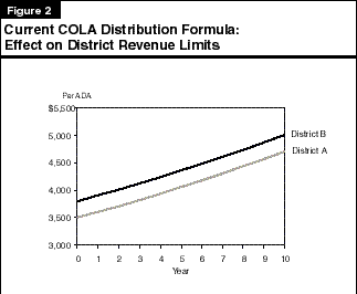 Current COLA Does Little for Equalization. The current uniform COLA sometimes is described as a "percentage equalizing" COLA. Figure�2 illustrates the operation of this COLA over time using two hypothetical districts A and B.