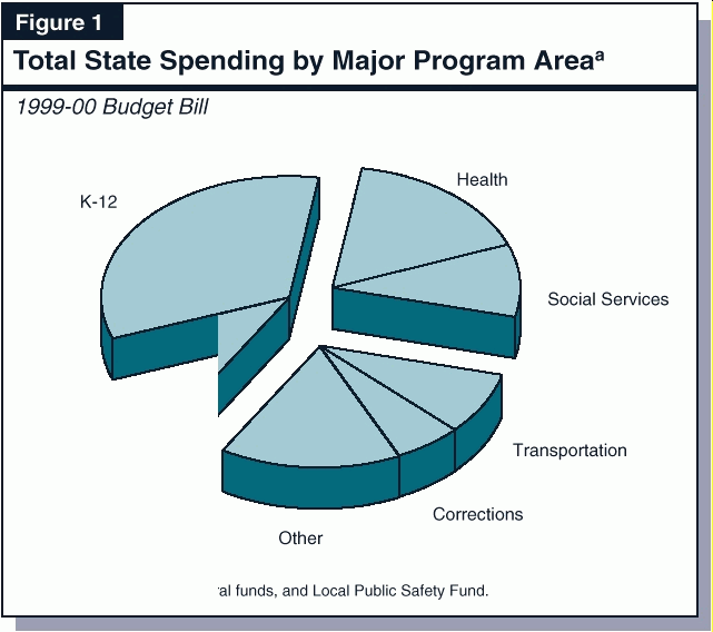 The Legislature passed the 1999-00 Budget Bill and sent it to the Governor on June�16, 1999. The budget bill and related implementing legislation comprise a budget package that authorizes total state spending of $80.2�billion in 1999-00. Of this total, $64.1�billion is from the General Fund and $16.1�billion is from special funds. Figure�1 shows the distribution of total state spending by major program area.