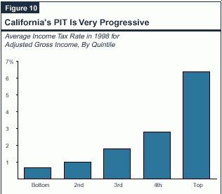 The Distribution of the Tax Burden. The combination of California's progressive tax rate structure and the increasing concentration of income at the top of the distribution--especially capital gains and stock options--has had a dramatic effect on the distribution of PIT liabilities in California. In 1998, we estimate that about 85�percent of total PIT liabilities were attributable to taxpayers in the top 20�percent of the income distribution--up from about 70�percent one decade ago.