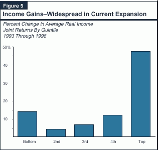 Widespread growth in average incomes reported on joint returns is clearly evident in the current economic expansion. As shown in Figure�5 (see page 7), over the five-year period from 1993 to 1998, average incomes grew by nearly 50�percent in the top quintile, but also grew modestly at the bottom and middle segments. Given current tight labor markets, we expect income increases to continue throughout the income distribution in the near-term future.