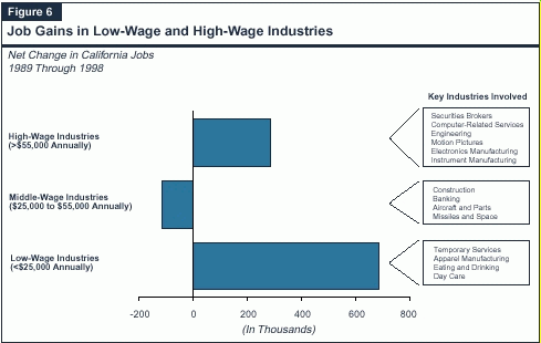 The net impact of these job changes during the past decade is illustrated in Figure�6 (see page 8), which divides net job growth in California between 1989 and 1998 into three categories: low-wage industries (those with average industry-wide wages of less than $25,000 per year); medium-wage industries (those with average wages of between $25,000 and $55,000 per year); and high-wage industries (those with average wages of more than $55,000 per year). The figure shows that while job increases occurred at both the top and bottom, job losses occurred in middle-wage industries. These changes significantly contributed to the increased income inequality that currently characterizes California.