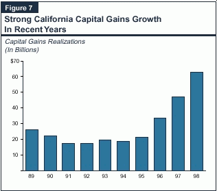 Given this concentration of financial holdings, the dramatic appreciation in stock market values in recent years has resulted in major increases in investment earnings of high-income households. As shown in Figure�7, California capital gains realizations rose from about $20�billion in 1990 to $60�billion in 1998, roughly tripling over the eight-year period. Moreover, preliminary information indicates that gains increased to over $85�billion in 1999--a year-to-year increase of over 40�percent. Since more than 90�percent of capital gains are attributable to the top quintile of the income distribution, the explosion in capital gains has had a major impact on the overall income distribution. \