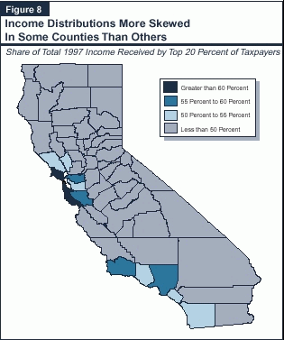 Figure�8�(see page 10) provides regional information on California's income distribution by showing the proportion of total taxpayer income in each county that is attributable to the top 20�percent of returns. It shows that the degree of income inequality is relatively high in the San Francisco Bay Area, as well as in the coastal regions of Southern California. Income inequality is less pronounced in the inland regions of the state.