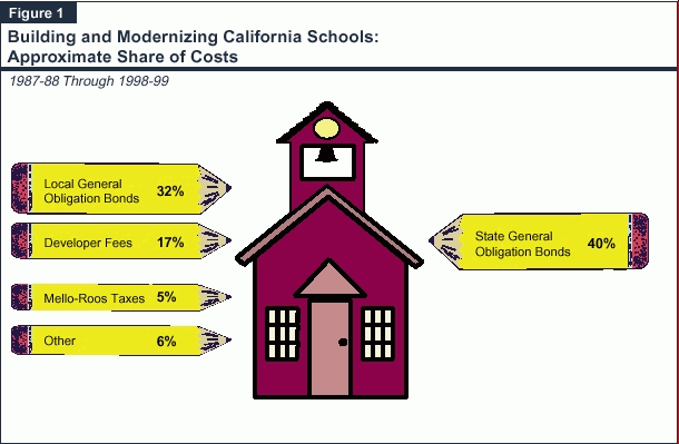 As Figure 1 indicates, California school districts have paid about 60 percent of the total cost of school remodeling and construction, raising most of this money from property tax overrides and developer fees. The state, in turn, has financed about 40 percent of school facility costs, using the proceeds of voter-approved general obligation bond programs.
