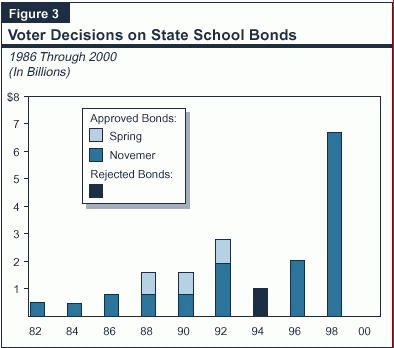Although districts typically incur capital outlay expenses every year--refurbishing or constructing facilities, acquiring land, or developing architectural plans--the state offers facility aid on an unpredictable basis. As Figure 3 shows, state voters have approved general obligation bonds for schools 11 times over the last 20 years and rejected them once. State bonds are usually fully depleted before additional funds are authorized by voters, leaving "hills and valleys" of revenue availability. This unpredictability in state funding impairs district capacity to plan, build schools, and raise supplementary local funds.