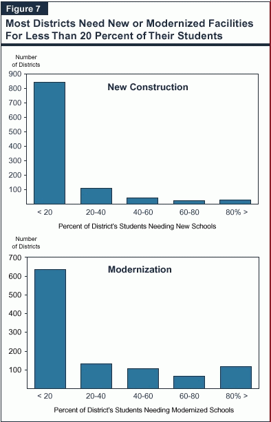 Examining this identified school facility need more closely, Figure 7 (see page 18) displays information on districts' current need to build new schools or modernize facilities for students as a percentage of a district's total enrollment. As the figure indicates, most districts' need for new construction and modernization projects affects a relatively small percentage of their enrollment. Specifically, over 800 districts (or about 80 percent) have a need for new facilities for less than 20 percent of their enrollments. Similarly, more than 600 districts (about 60 percent) have modernization needs for less than 20 percent of their enrollments.