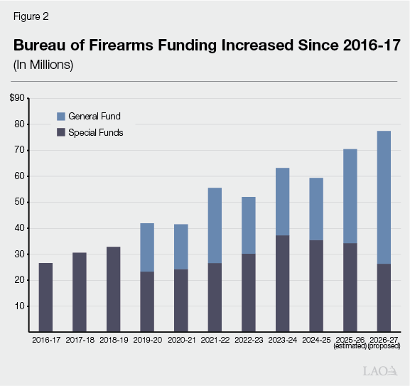 Overall BOF Funding and General Fund Support Increased Over Past Decade. As shown in Figure 2, support for BOF has increased over the past decade from $26.6 million in 2016-17 to $70.4 million in 2025-26—an increase of $43.8 million (or 165 percent). During this period, BOF also shifted from being fully supported by various special funds and began receiving General Fund support in 2019-20. Of the total $70.4 million provided to BOF in 2025-26, $36.2 million (or 51 percent) was from the General Fund and $34.2 million (or 49 percent) was from various special funds. A large portion of the General Fund support is used to support the Armed and Prohibited Persons System (APPS) enforcement teams, which seize firearms from people prohibited from owning or possessing them. Support for these teams was fully shifted over to the General Fund as part of the 2019-20 budget package. In the past couple of years, the General Fund—rather than special funds—have been used to support the costs of implementing some new firearm-related legislation and workload. (CJIS separately receives millions of dollars annually from several fund sources to maintain and update various databases needed to support BOF’s activities.)