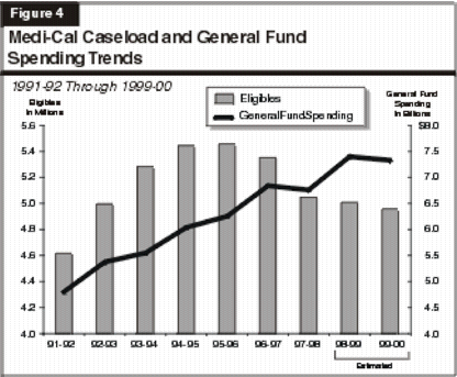 Figure 4 shows Medi-Cal caseload and General Fund spending since 1991-92. During the period 1991-92 through 1995-96, both caseload and spending rose in a roughly similar manner. The average annual growth rates were 4.3 percent for caseload and 6.8 percent for spending. Starting in 1996-97, however, the two trends diverge sharply, as caseload has declined while costs have continued to grow. From 1995-96 through the current year (as estimated in the budget) caseload has declined at an average annual rate of 2.7 percent, but costs have continued to rise at an annual rate of 7.8 percent. The "spread" between the growth rates for spending and caseload has grown from 2.5 percent in the earlier period to 9.7 percent from 1995-96 through the current year.