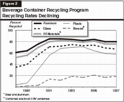 Figure 2 (see next page) shows the annual recycling rates for CRV beverage containers since 1988. As the figure illustrates, the 80 percent rate has been met for aluminum cans consistently since 1991, and for all beverage containers as a group from 1991 through 1995. However, recycling rates for glass, plastic, and bimetal (steel-and-aluminum) containers have never met the 80 percent goal.