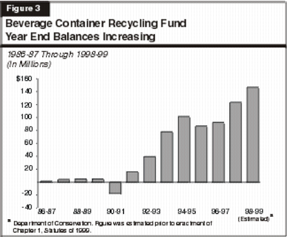 To the extent affected beverage containers are not redeemed for CRV, a reserve accumulates in the BCRF. Our review shows that the reserve of unredeemed CRV has continued to mount throughout the 1990s. Although statutory changes (as well as a one-time diversion of BCRF monies to the Department of Parks and Recreation) in 1995 resulted in a temporary reduction in the reserve, the fund balance has been growing ever since. Figure 3 shows the BCRF balances over time.
