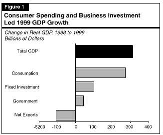 Most Sectors Were Strong. As indicated in Figure�1, the majority of the dollar increase in real GDP between 1998 and 1999 was attributable to consumer expenditures. Real consumer spending grew by 5.2�percent, led by particularly rapid increases in purchases of autos and other durable goods. Business fixed investment was the second largest contributor to GDP growth last year, reflecting booming business expenditures on computers and software, and continued increases in nonresidential construction activity. The only "soft spot" in the economy was foreign trade, where strong US demand for imported goods caused the US merchandise trade deficit to increase sharply during the year.