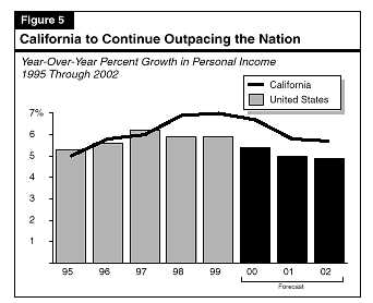 As regards California, the budget forecast assumes that the state will continue to outperform the nation during the next two years. Personal income growth is forecast to slow only marginally--from 6.6�percent in 1999 to 6.5�percent in 2000--before further slowing to 5.7�percent in 2001. The budget forecasts similarly healthy but moderating increases for employment, led by computer-related services and the construction industry.