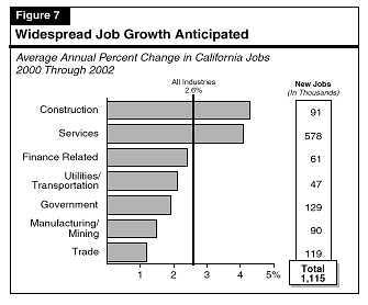 As indicated in Figure�7, over the three-year period 2000 through 2002, California wage and salary jobs are projected to increase at an average annual rate of nearly 2.6�percent. In numeric terms, over one-half of the new jobs are expected to be in the state's large and diverse service sector, reflecting gains in business services, hotels, automotive repair, health services, and entertainment. In percentage terms, the fastest-growing sector will continue to be construction, where employment is expected to grow by about 4.3�percent, reflecting continued gains in both residential and nonresidential building activity in the state.