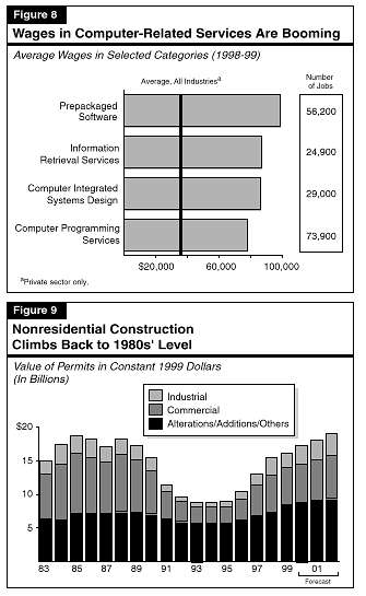 Jobs in computer-related business services have been increasing at a dramatic pace. We estimate that growth over the past year has exceeded 15�percent, and that total jobs in these industries amount to more than 300,000. The computer services industry is now about twice the size of the state's aerospace industry. As indicated in Figure�8, wages in key sub-sectors within the computer services industry averaged between $80,000 and $100,000 last year, well over twice the economy-wide average. We expect that employment in computer-related services will continue to expand by more 10�percent annually in both 2000 and 2001, making it one of the fastest growing employment categories in the state.