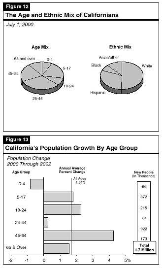 Figure�11 (see page 32) summarizes the LAO's updated demographic forecast. We predict that California's total population will rise from an estimated 34.6�million in 2000, to 35.2�million in 2001 and 35.8�million in 2002. This translates into an annual growth rate of somewhat over 1.6�percentless than the boom years of the late 1980s but still well above the nation's 0.9�percent.