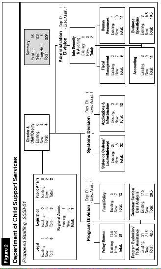 The Governor's budget proposed a total of 229�positions for the DCSS (see Figure�2 on page 134). The department is organized into the following units: Executive offices; Program Division; Systems Division; and Administration Division. While the Program Division includes a significant increase in positions (compared to the staffing levels in DSS), we recommend approval of this component because (1)�a significant proportion of the new workload is to carry out new tasks required by the legislative reforms, and (2) we believe there is a need to provide more program support in order to improve the performance of the local child support programs. With respect to the proposed staffing level for the Administrative Division, however, we find that the budget (1)�proposes more positions than are needed and (2)�underestimates the number of positions that should be transferred from DSS.