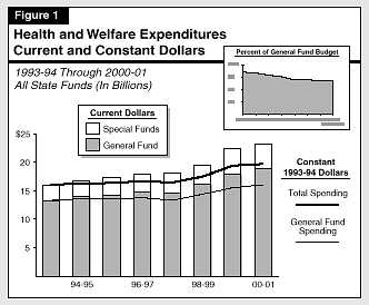 Figure 1 (see next page) shows that General Fund expenditures (current dollars) for health and social services programs are projected to increase by $5.6 billion, or 42 percent, from 1993-94 through 2000-01. This represents an average annual increase of 5.2 percent.