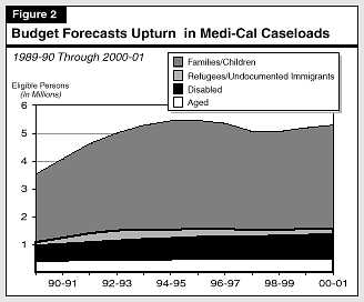 Medi-Cal Caseloads. Medi-Cal caseloads increased by 51 percent over the 12 years shown in Figure 2. As the figure shows, the growth generally occurred during the period from 1989-90 through 1994-95. The growth in the number of families and children receiving Medi-Cal during this period reflects the rapid growth in AFDC caseloads as well as the expansion of Medi-Cal to cover additional women and children with incomes too high to qualify for cash aid in the welfare programs. Coverage of refugees and undocumented persons also increased caseloads significantly during this period. Since 1994-95, Medi-Cal caseloads have declined, due primarily to a decline in AFDC/CalWORKs caseloads. The figure also shows that the caseload leveled off in 1997-98 and 1998-99. While the budget states that the caseload is forecasted to decline by 1 percent in 2000-01, this excludes the effect of an expansion in eligibility enacted in the current year. With this adjustment, the Medi-Cal caseload is estimated to increase by 2.6 percent in the current year and 1.9 percent in the budget year.